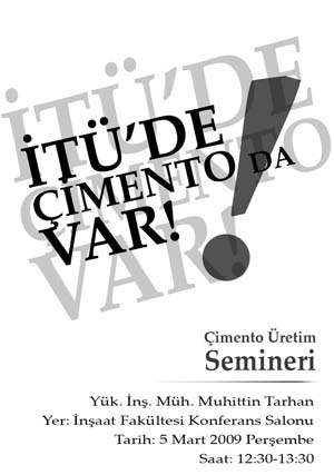 “Konuşmacı olarak İnş. Yük. Müh. Muhittin Tarhan’ın katılacağı seminerde çimentonun genel tanıtımı yapılarak, başlangıcından sonuna kadar üretim evrelerine değinilecektir. Akabinde, Değişik çimento çeşitlerinden ve sağladıkları yararlardan bahsedilecektir. “
